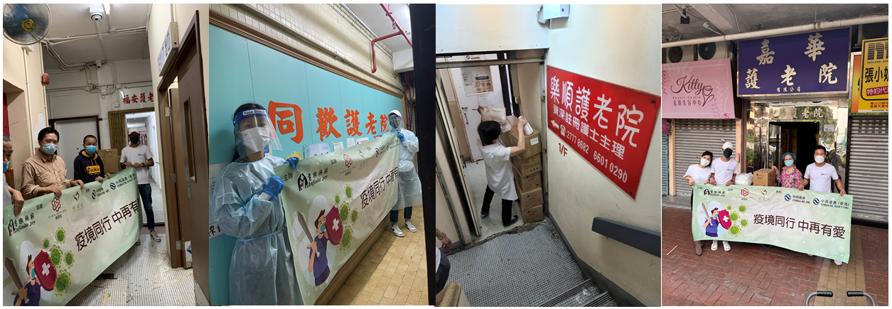 中再员工代表与慈善机构共同组建的义工队,专门驱车前往各区受疫情影响较大的护老院派发短缺物资。义工队从香港西北部的元朗培康居护老院出发,途径屯门嘉华护老院、深水埗乐顺护老院,紧跟着奔赴香港岛铜锣湾福安护老院,最后抵达港岛南香港仔同欢护老院,行程横跨大半个香港。本次捐助的5家护老院均为香港私立护老院,院友总计约二百二十人,主要为孤寡及长期患病的老人,院舍条件较差、基础实施不足,严重缺乏防疫物资,多次向社会呼吁捐助支持。本次活动中再驻港机构携手捐助了250份抗疫爱心包,其中包括医疗级全身防护服,医疗一次性手套,N95口罩以及消毒酒精等消毒防护物资,为处于疫情漩涡中的老年群体雪中送炭,尽力帮助孤苦老人免受新冠病毒的威胁。